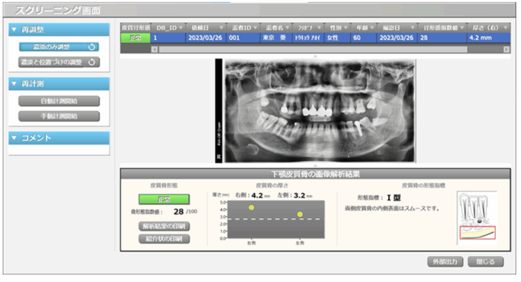 使用するのは、株式会社メディアが開発したAI搭載画像解析ソフト「PanoScope」。このソフトにより、パノラマレントゲン画像から皮質骨の厚みなどを自動計測し、骨粗鬆症のリスクを数値で可視化できるようになります。
